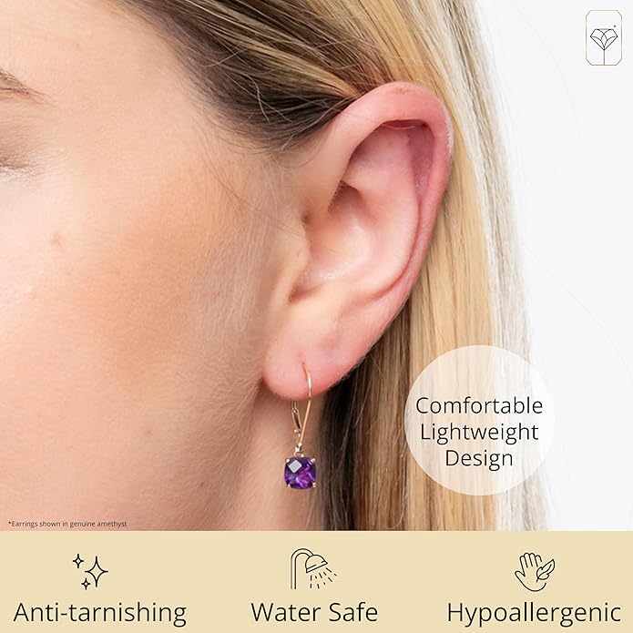 Solid 10K Gold Cushion Cut Dangle Gemstone Earrings for Women | 6mm Gemstone Birthstone Earrings | Checkerboard 10 Karat Gold Dangle Drop Leverback Earring for Women by MAX + STONE