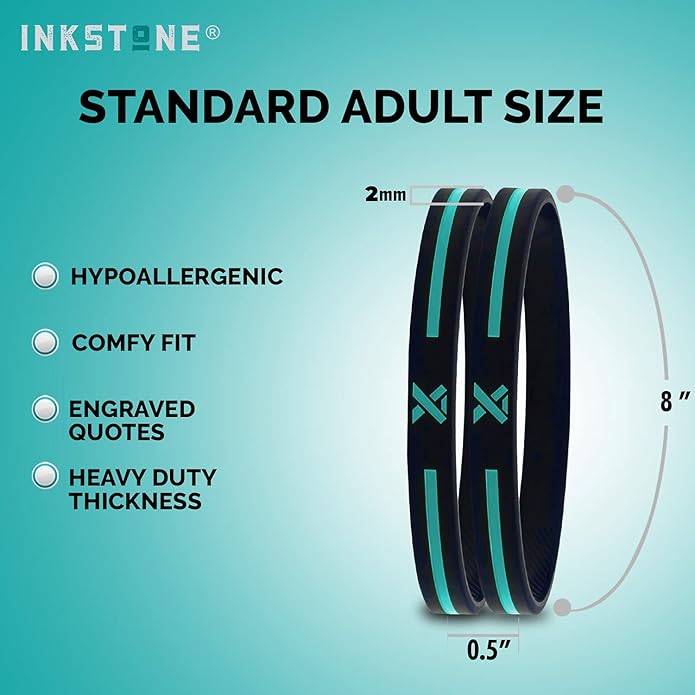 - Bulk pack of 12 silicone awareness bracelets with teal awareness ribbon color theme