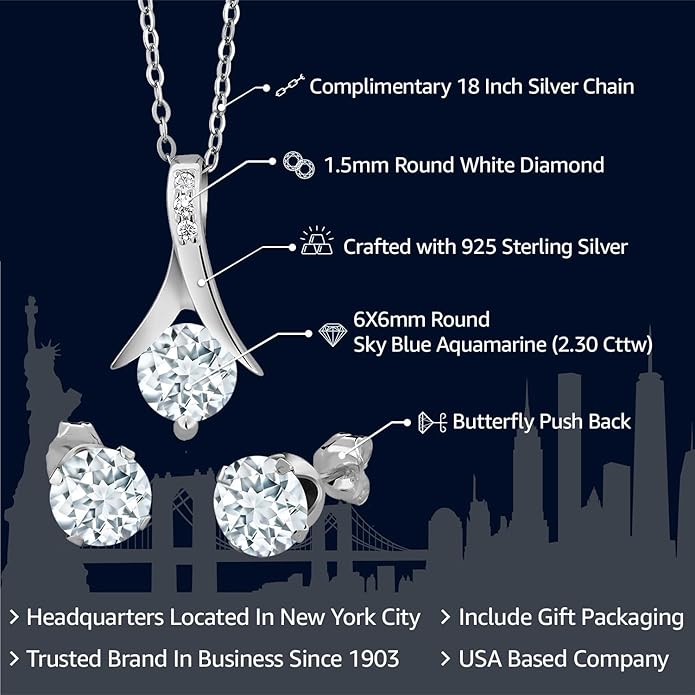 - EXQUISITE SKY BLUE AQUAMARINE: This pendant and earrings set features exquisite sky blue aquamarine gemstones that add a touch of elegance and sophistication. The round cut enhances the natural beauty of the aquamarines, allowing them to sparkle and shine. Total Carat Weight is 2.3 cttw.