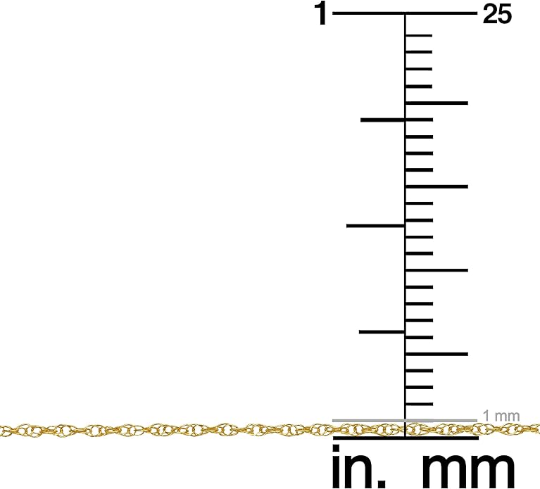 - DIMENSIONS - This rope chain is 1 millimeter wide and 18 inches or 45.7 centimeters long. This 14k gold chain is thin and lightweight. It secures with a spring ring clasp. Approximate weight is 0.93 grams.