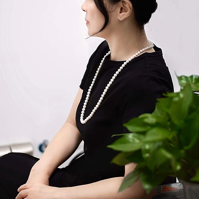 - 30 Inch 8-8.5mm ROUND & LONG Pearl Necklace ***** Genuine cream white one strand cultured freshwater pearl jewelry; Sturdy unisex 925 Sterling Silver white gold-plated pea clasp.