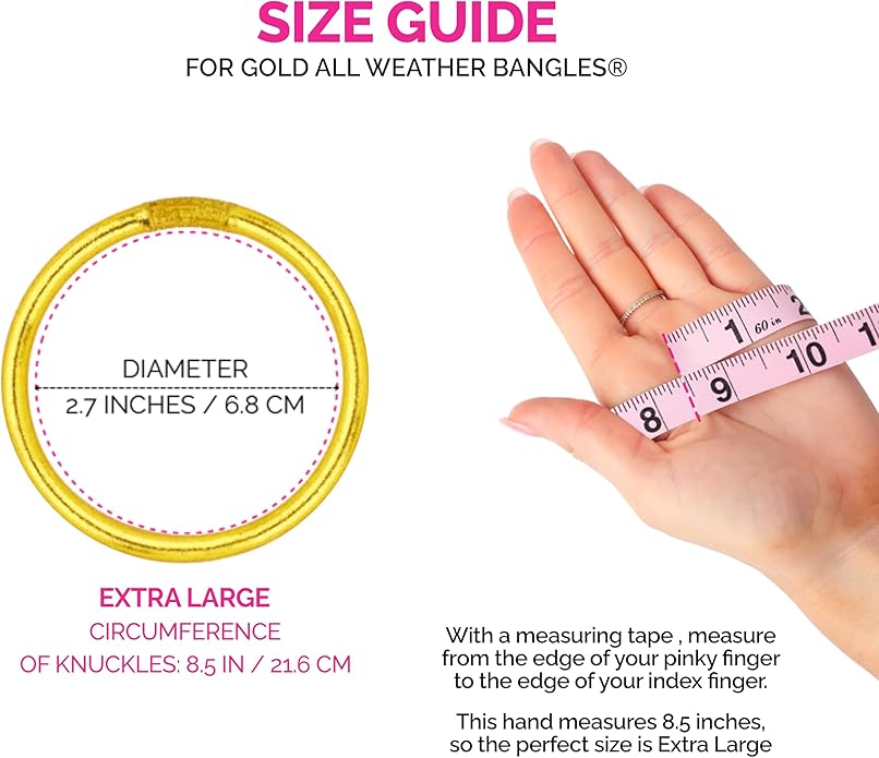 - Size & Fit – How to Measure: These Large Gold All Weather Bangles have a circumference of 8.5 in. (21.6 cm) and a diameter of 2.7 in. (6.8 cm). To confirm your size, use a measuring tape across your knuckles—from the edge of your pinky finger to the edge of your index finger. If your hand measures 8.5 inches, Large is the perfect fit. (See size guide image in Listing Images.)