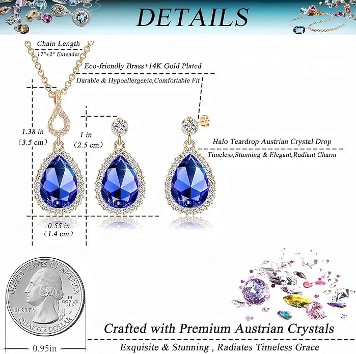 Austrian Crystals Teardrop Pendant Necklace Earrings for Women 14K Gold Plated Hypoallergenic Jewelry Set