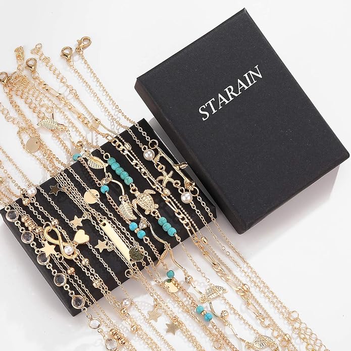 - Anklets for Women: Every black gifts box contain 16 pcs different styles of anklets, like cute elephant, turtle, stars, pineapple, beads and fashion multilayer infinity anklets etc. Share some of them with your best friends or sisters also will be a great choice.