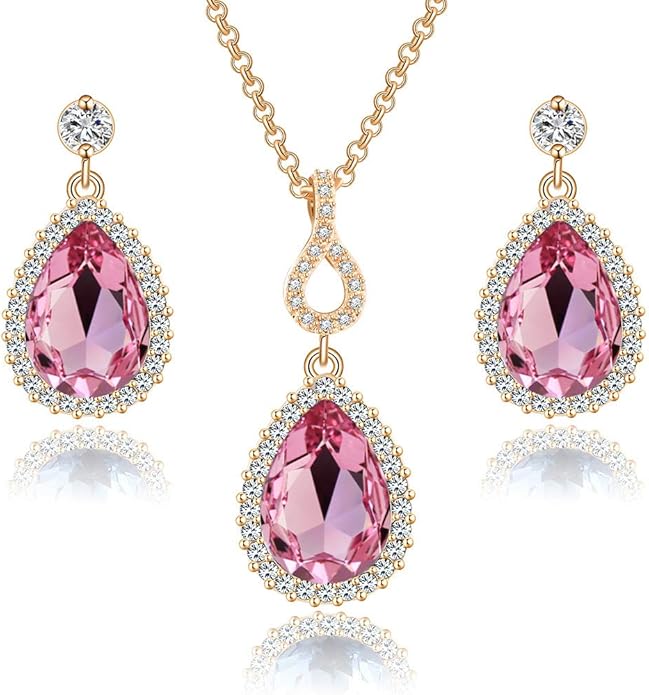 Austrian Crystals Teardrop Pendant Necklace Earrings for Women 14K Gold Plated Hypoallergenic Jewelry Set