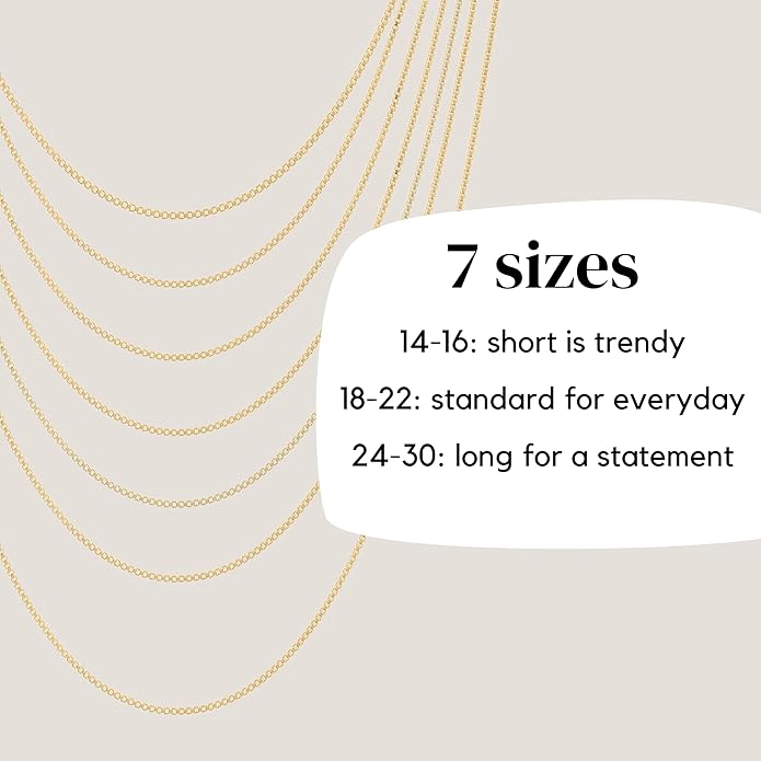 - Select Your Size – The 24-inch chain fits perfectly over the head without having to unclasp. Choose a chain length that suits your taste. Thin and perfect for layering, your chain is available in 7 sizes from 14 inches (small and at the neck’s hollow) to 30 inches (long and mid-torso).