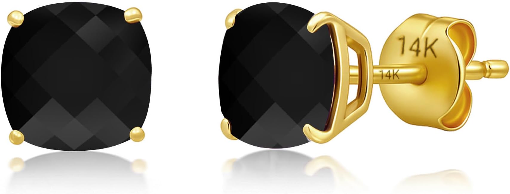 - Genuine Onyx Earrings - These cushion cut gemstone onyx stud earrings for women are handset with natural onyx stones measuring 6mm each. Because of its natural origin, Onyx birthstone shades may vary. These birthstone stud earrings have push backs to secure them