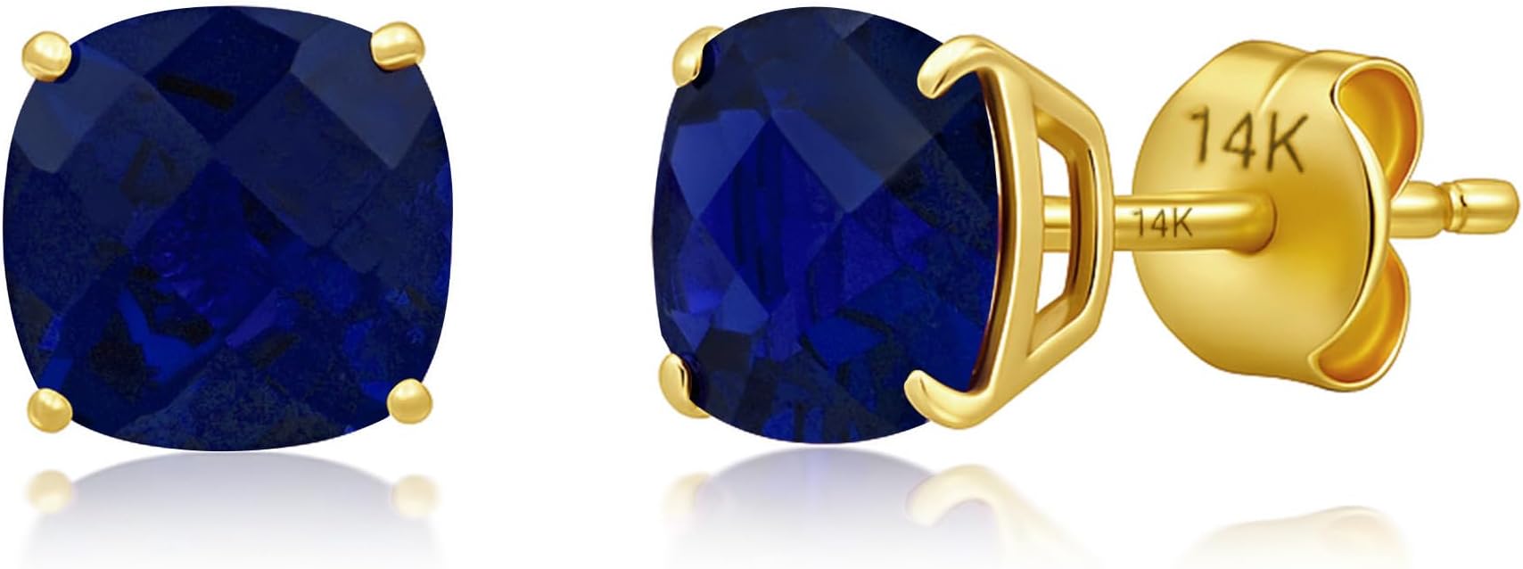 - Sapphire Gemstone Earrings - These cushion cut gemstone stud earrings are handset with lab created sapphire stones measuring 6mm each. Due to the unique nature of lab-created sapphire, colors may vary, offering a range of stunning shades. Blue earrings have push backs to secure them