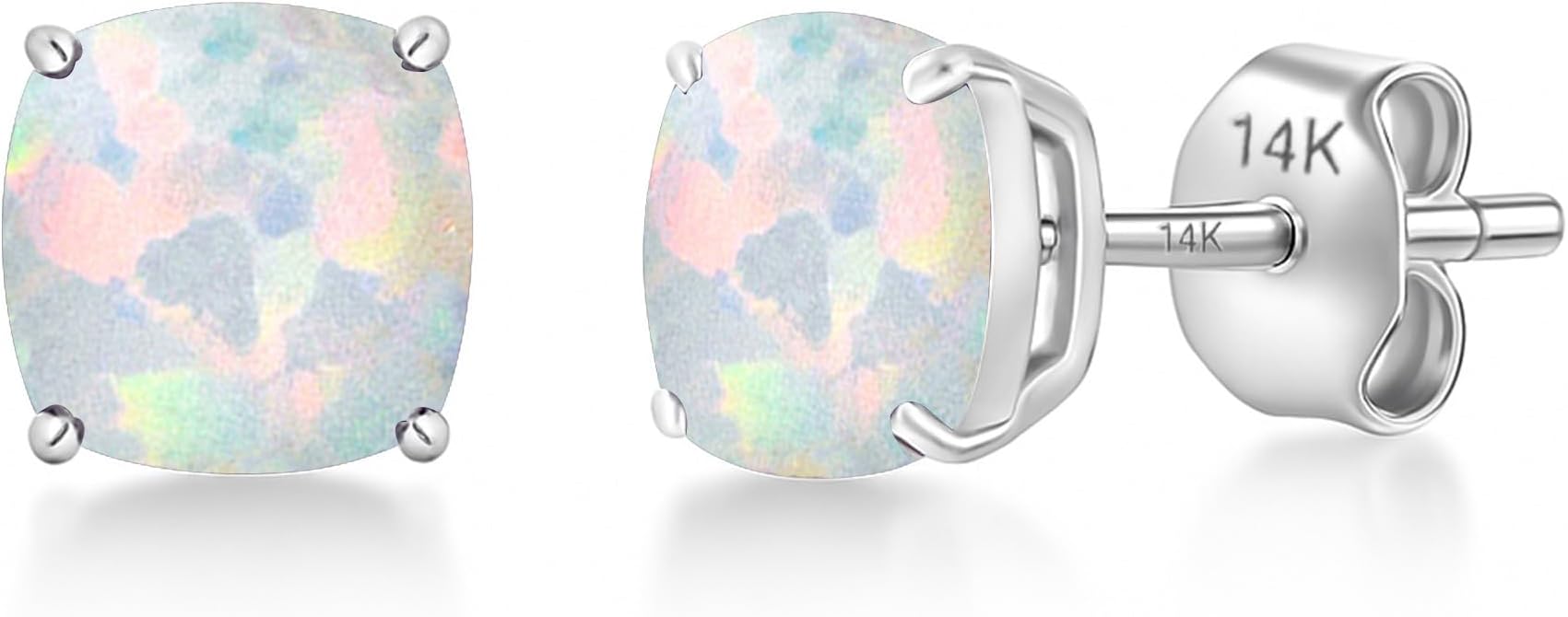 - Lab Created Opal Earrings - These cushion cut gold opal earrings are handset with lab created opal stones measuring 6mm each. Due to the unique nature of lab-created opals, colors may vary, offering a range of stunning shades. Opal studs earrings for women have push backs to secure them
