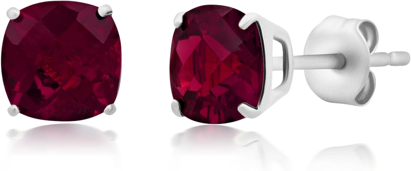 - Ruby Gemstone Earrings - These cushion cut gemstone stud earrings are handset with lab created ruby stones measuring 6mm each. Due to the unique nature of lab-created ruby, colors may vary, offering a range of stunning shades. Red earrings have push backs to secure them
