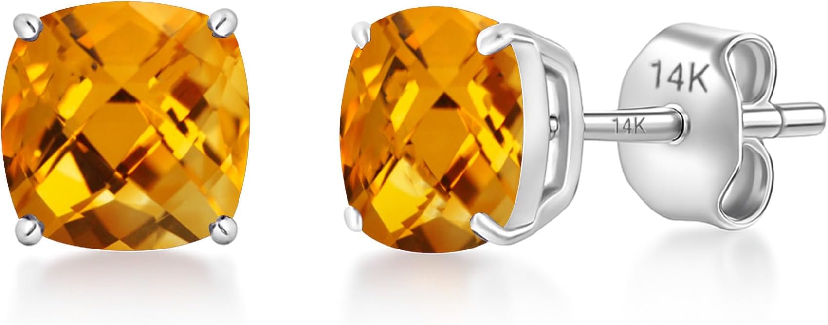 - Genuine Citrine Earrings - These cushion cut gemstone stud earrings for women are handset with natural citrine stones measuring 6mm each. Because of its natural origin, citrine birthstones shades may vary. Yellow stud earrings for women have push backs to secure them