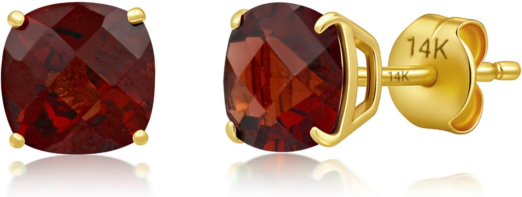 - Genuine Garnet Earrings - These cushion cut gemstone stud earrings are handset with natural garnet stones measuring 6mm each. Because of its natural origin, garnet birthstone shades may vary. Red earrings have push backs to secure them