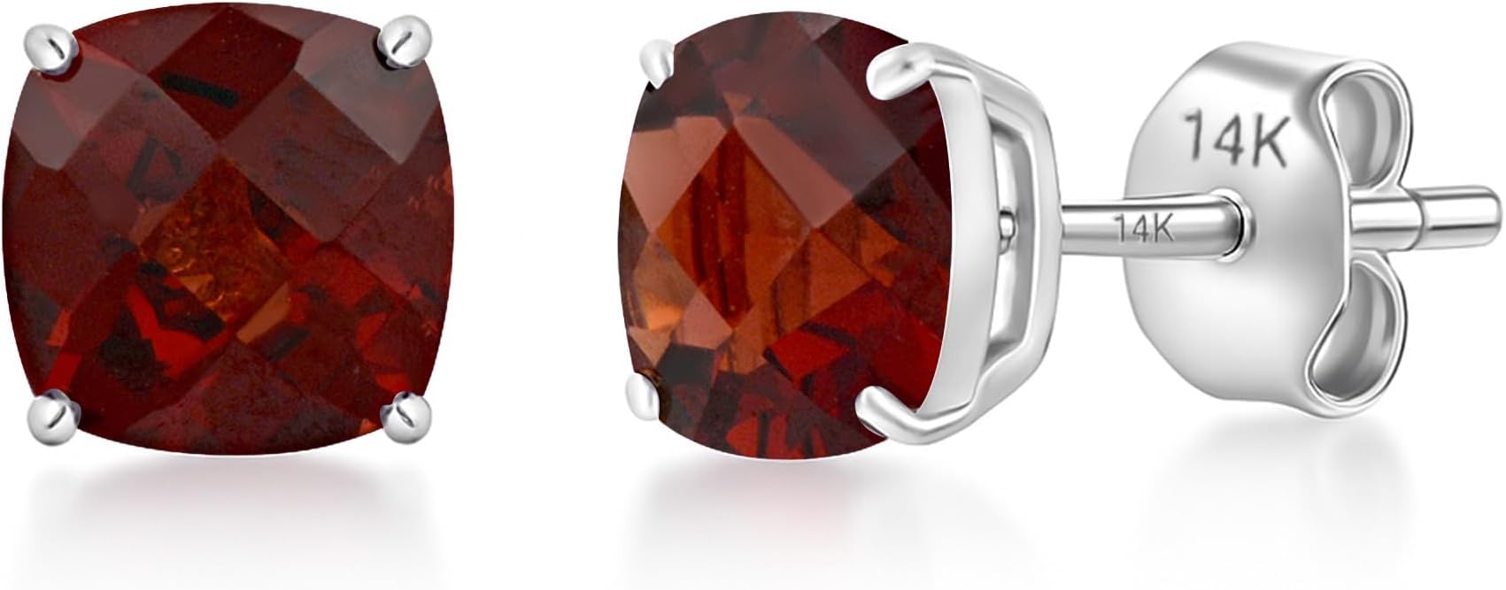 - Genuine Garnet Earrings - These cushion cut gemstone stud earrings are handset with natural garnet stones measuring 6mm each. Because of its natural origin, garnet birthstone shades may vary. Red earrings have push backs to secure them