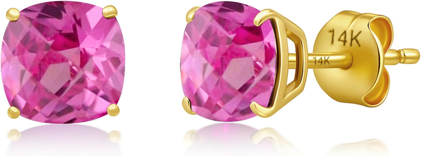 - SEPTEMBER BIRTHSTONE EARRINGS - These cushion cut gemstone stud earrings have handset lab created pink sapphire stones measuring 6mm. Pink sapphire birthstones signify love & truth. Lab created pink gold stud earrings have push backs.