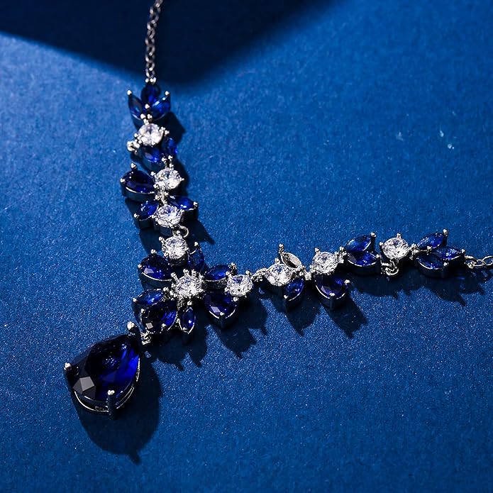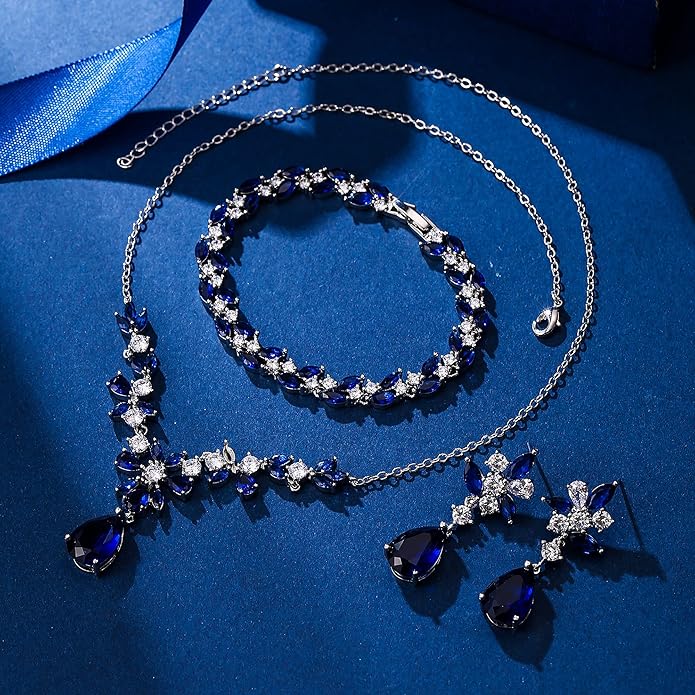 - ♥Specification: CZ Color: Sapphire, Necklace Length: 18inch-19.7inch, Teardrop Pendant: 3.1inch*1.3inch, Dangle Earrings: 1.4inch*0.3inch; Tennis Bracelet Length: 6.9inch-8.2inch, Width: 0.2inch, Total Weight: 33g.