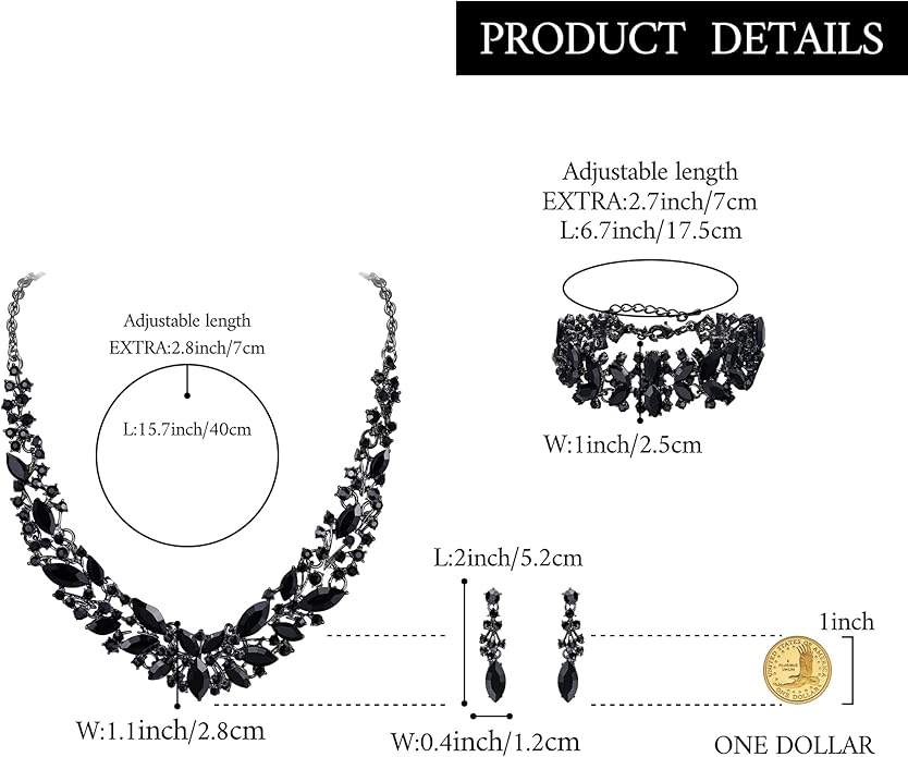 • Specifications and Size: Necklace: Pendant Size: 8.4*1.1 in; Chain Length (Adjustable): 19.3-21.6 in. Earrings Size (Pierced): 1.9*0.4 in; Bracelet Size:9.6*1in;Each Piece Weight: 0.15oz/4.2g. Total Weight: 90g.
