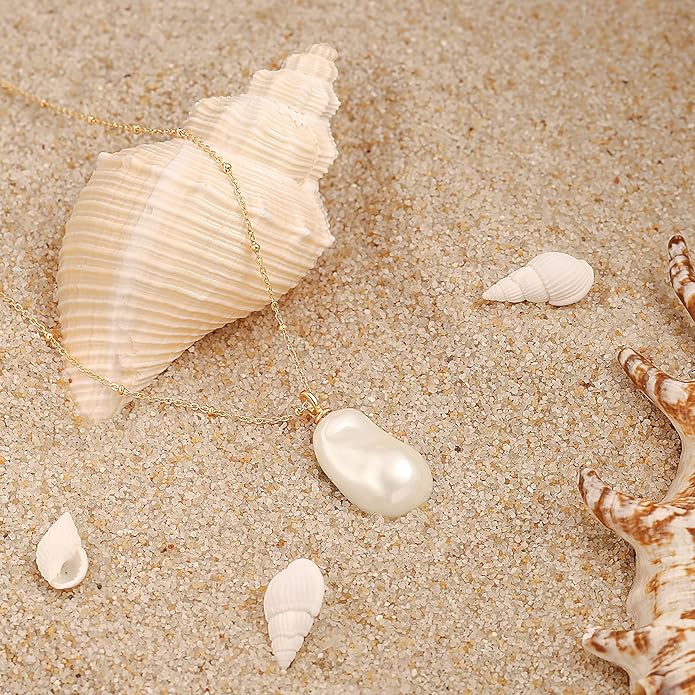 - 【DESIGN】This pearl necklace is very simple, but very eye-catching. The combination of thin gold chain and white pearl looks very fashionable and elegant. The large shell pearl pendant has a very good luster and looks beautiful whether you wear it in a dark or bright place. The irregular pearl pendant breaks the style of the traditional round pearl, it is more individual, you can wear it with other chokers, it will add extra points to your outfit.