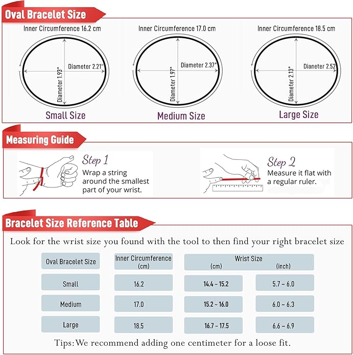 - 【 Ideal Size 】 The inner circumference of the 18K Gold-plated bracelet is 18.5 cm , the width is 6 mm, and the inner diameter is approximately 2.52 X 2.13 inches, suitable for wrist sizes from 6.6" to 6.9". In addition, this love bangle is not too heavy but also not too light, great everyday accessory to add a little style to your outfit. Tips: To determine your bracelet size, we advise that you measure the size of your wrist before purchasing.