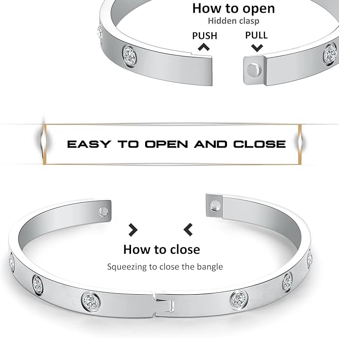 - 【 Easy to use 】 The love bangle with hidden clasp is simple and elegant and very easy to get on /off for adults. Insert your index finger and pull the top part and use your thumb to push the bottom part. For a better understanding of the usage, the user manual with exact details would be attached in the package