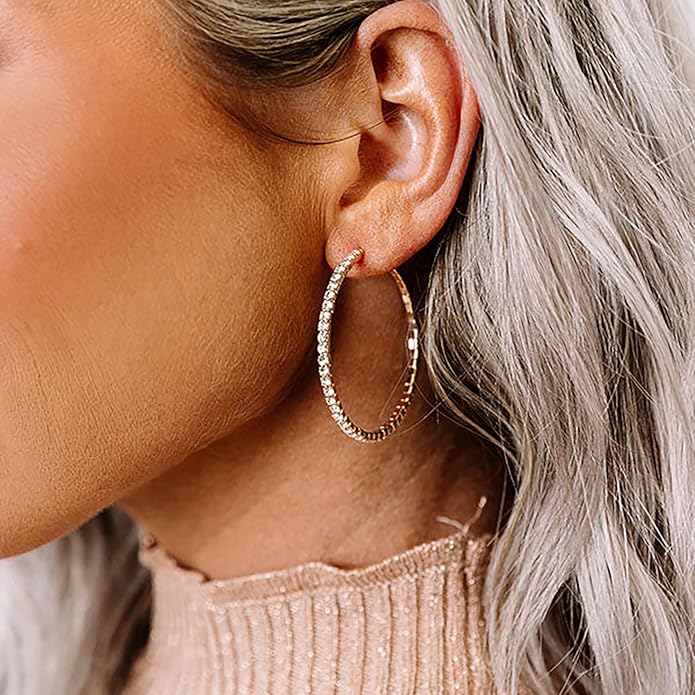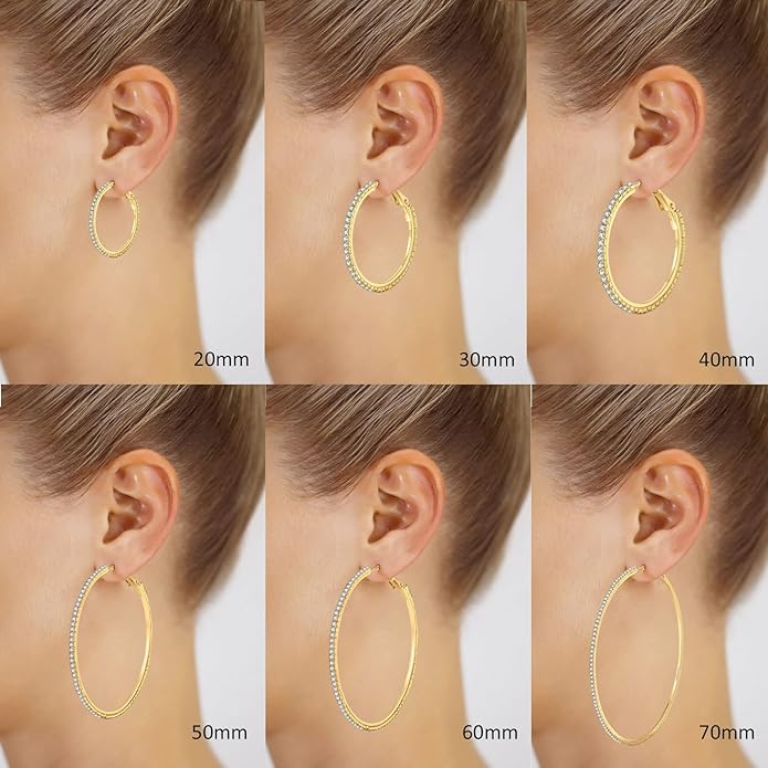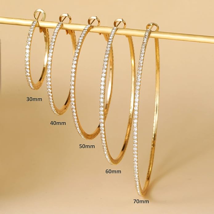 - RHINESTONE HOOP EARRINGS:2mm thin thick hoop earrings, Different sizes to meet your daily needs, hoop diameter:20mm / 30mm/ 40mm/ 50mm/ 60mm/ 70mm. large gold hoop earrings, Get your glam on with our Crystal Hoop Earrings. Glamorous clear crystals in gold settings shape these trendy hoop earrings.