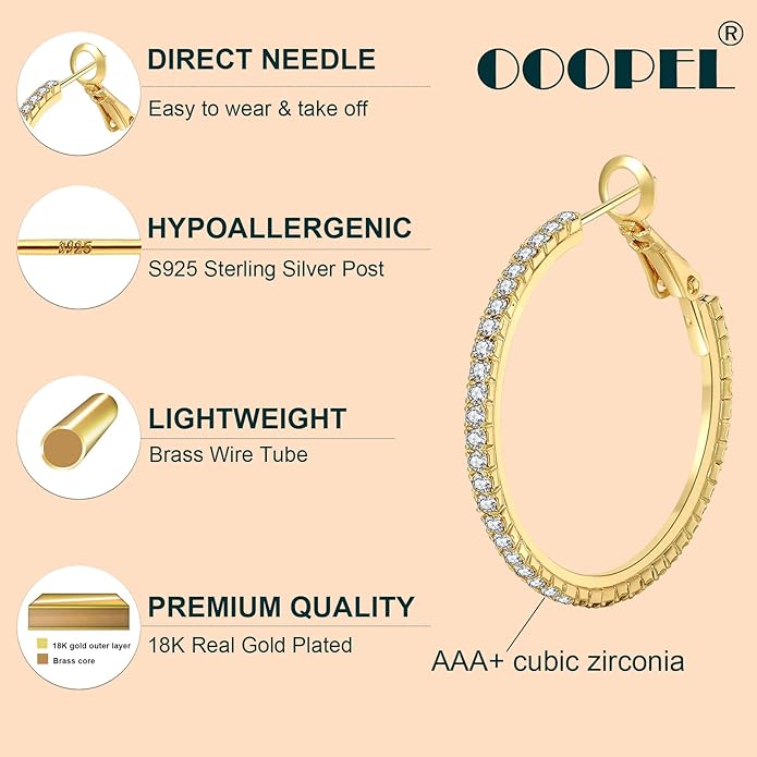 - HYPOALLERGENIC HOOPS EARRINGS FOR WOMEN:crystal hoop earrings for women are made of high quality 18K gold plated copper with S925 sterling silver post, Gold rhinestone earrings with AAA+ cubic zirconia, long-term color preservation, no fade, and rust, lead and nickel free, they won't hurt your sensitive ears. Excellent materials for sensitive ears in daily use.