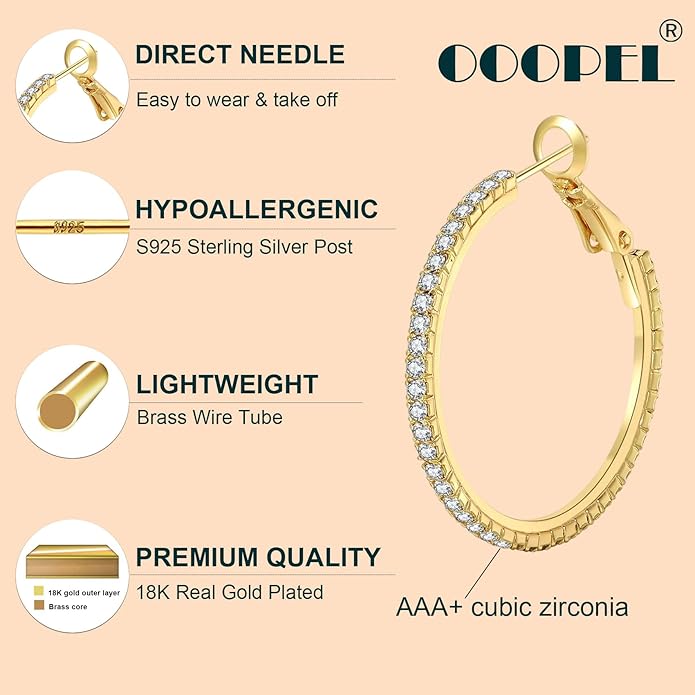 - HYPOALLERGENIC HOOPS EARRINGS FOR WOMEN:Crystal hoop earrings for women are made of high quality 18 Karat gold-plated copper with S925 sterling silver post, Gold rhinestone earrings with AAA+ cubic zirconia, long-term color preservation, no fade, and rust, lead and nickel free, they won't hurt your sensitive ears. Excellent materials for sensitive ears in daily use.