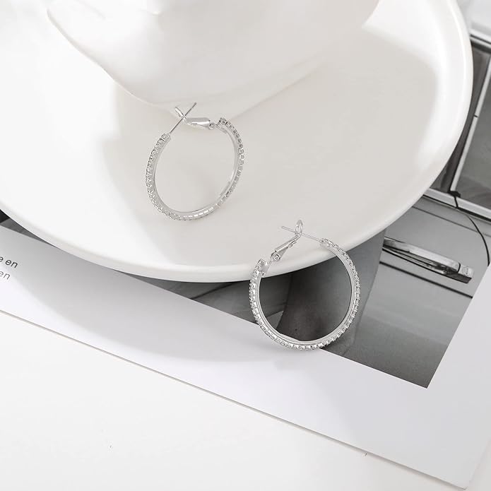 - HYPOALLERGENIC HOOPS EARRINGS FOR WOMEN:crystal hoop earrings for women are made of high-quality copper with S925 sterling silver post, silver rhinestone earrings with AAA+ cubic zirconia, long-term color preservation, no fade, and rust, lead and nickel free, they won't hurt your sensitive ears. Excellent materials for sensitive ears in daily use.