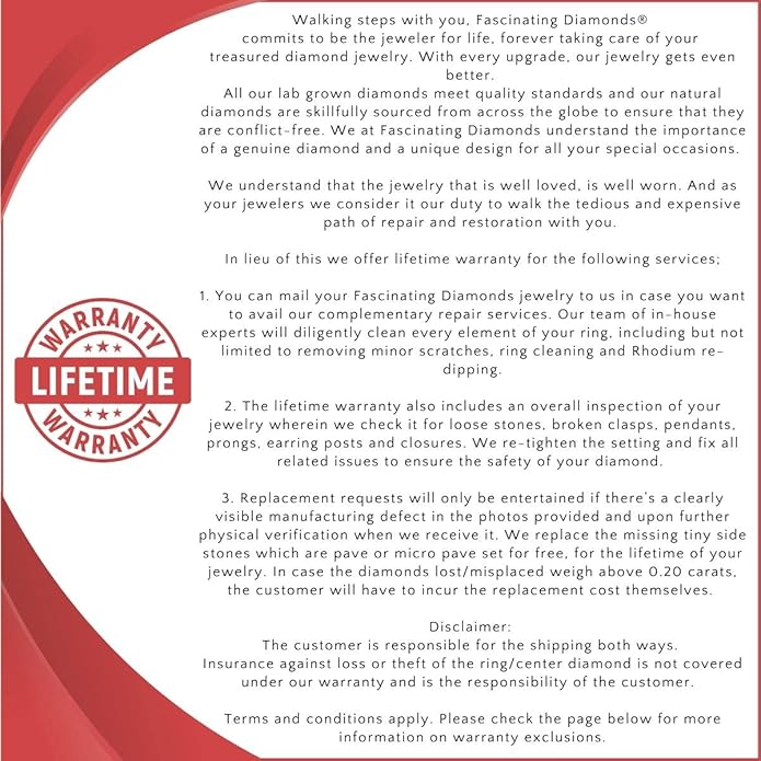 - LIFETIME WARRANTY: Our lifetime warranty offers free prong tightening, re-polishing, rhodium plating and cleaning services. Gift box included. If in case any small diamonds or center stone is lost, it can be replaced at a cost.
