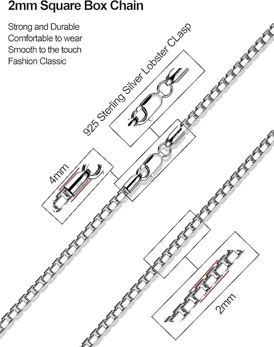 - 『Classic Fashion』 - Introducing the Silver Square Box Chain, a resilient and radiant accessory that effortlessly enhances your style. This chain showcases a easy-to-use 925 sterling silver clasp and a durable lobster clasp adorned with a sleek cylindrical end, guaranteeing a secure and unwavering grip around your neck, even when paired with Large pendants. The square box-shaped design of the chain exudes an everlasting and ageless allure, surpassing transient fashion trends.