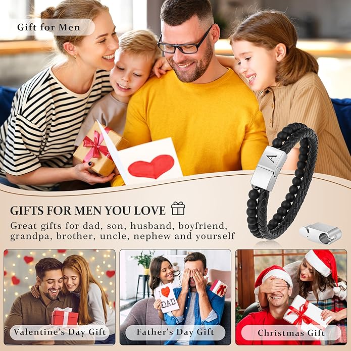 - 🎁INITIAL BRACELET: 26 letters are engraved on stainless steel clasp. Customize a unique and personalized initial bracelet for him. Special gifts for Father's Day, Birthday, Valentine's Day, Thanksgiving, Graduation, Christmas, Anniversary......