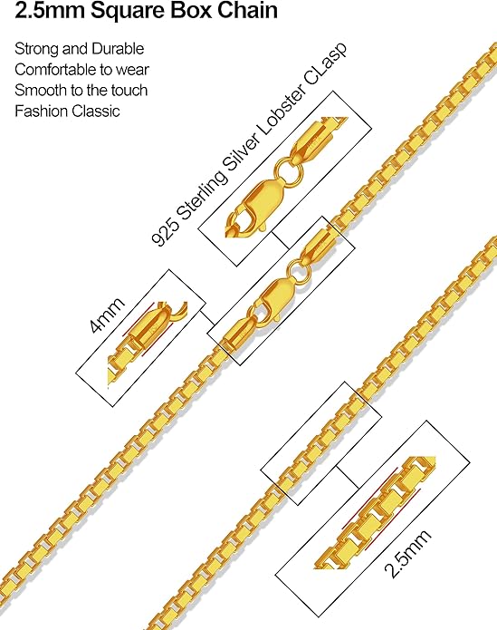 - 『Classic Fashion』 - Introducing the Gold Plated Square Box Chain, a resilient and radiant accessory that effortlessly enhances your style. This chain showcases a easy-to-use 925 sterling silver clasp and a durable lobster clasp adorned with a sleek cylindrical end, guaranteeing a secure and unwavering grip around your neck, even when paired with Large pendants. The square box-shaped design of the chain exudes an everlasting and ageless allure, surpassing transient fashion trends.