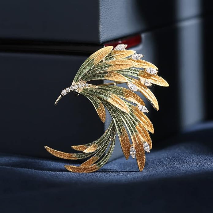 14K Gold Phoenix Tail Feather Brooch, Sparkling Moissanite Enamel Brooch - Beautiful Brooch Jewelry Gift