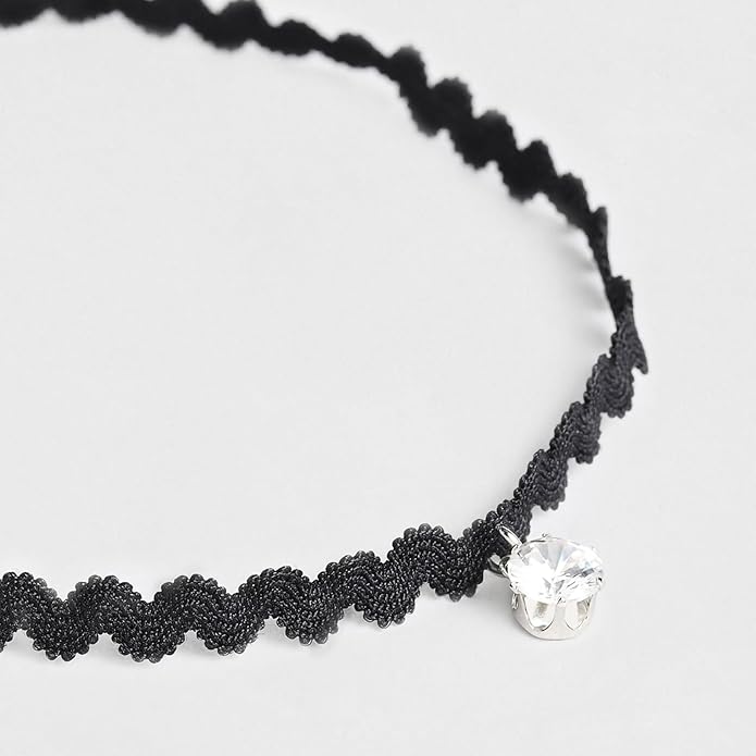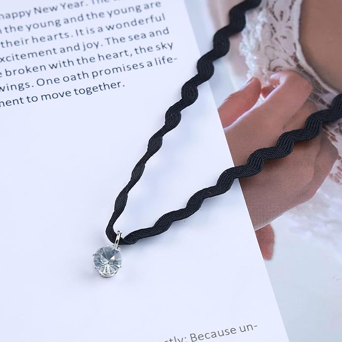 - Classic Design: The black necklace features a simple design that adds a touch of sophistication to any outfit. It consists of a black wave band and a rhinestone pendant that sits comfortably around the neck, highlighting the collarbone area.