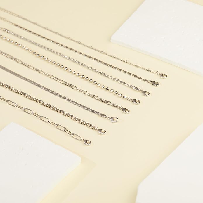 - STYLISH SILVER ANKLET SET: You will receive 7 styles of anklet. Our silver anklets sets for women include beaded ball chain, Cuban chain, paperclip chain, snake chain figaro chain, rope chain, and mirror chain. You can combine and match at will according to your own dressing style