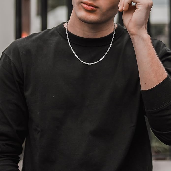 - SILVER CHIAN FOR MEN NECKLACE - Solid 925 sterling silver clasp, 3mm rope chain crafted with diamond cut, Italian craftsmanship gives this classic silver necklace the most fashionable feel, this classic style silver rope chain is a perfect jewelry for men women to get a fashion look and style. Perfect rope chain for men women jewelry collection.