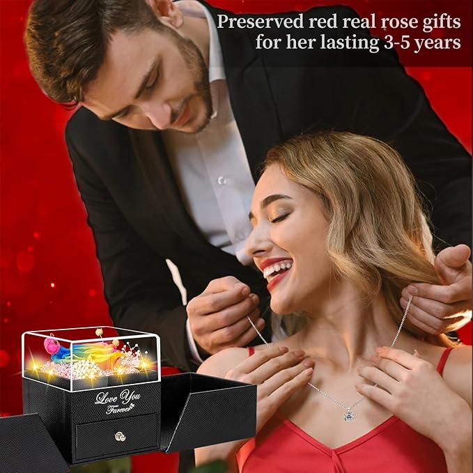 - 🎁【Im Sorry Gifts for Her Package】Mother's Day Gift Ideas Preserved Roses are well wrapped in the gift box,so that you could give directly without spend time on package. As an exquisite luxury gift,it can also store other jewelry. The necklace can be worn, and the rose box can be placed indoors as an ornament,Your lover will feel happy every day looking at it. 1 Preserved Eternal Rose + 1 Gift Box + 1 Double Heart Necklace(With I Love You Necklace in 100 Languages)+ 1 Gift Bag + 1 Greeting Card.