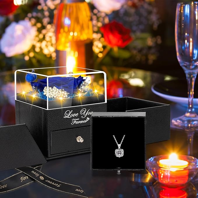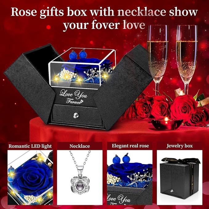 - ❤ 【 Preserved Rose with Necklace】Unique double heart-shaped structure and is engraved with " I LOVE YOU necklace 100 Languages " to express love to her. The two hearts are tightly intertwined, symbolizing the love for each other and it will be an exclusive gift for her.The i love you necklace on hidden inside bottom of the rose box, as a romantic gifts for her, Unique design of double love "I LOVE YOU necklace" and gift box preserved rose, gift Ideas for women for every romantic occasion.
