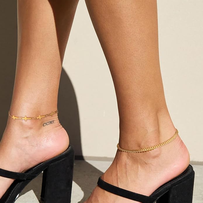 - HIGH QUALITY ANKLET: Brass filled gold cuban and cross anklets, no tarnish, lead free, nickel free. Great for sensitive skin and all-day Wear