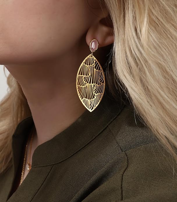 - DESIGN: We are so in love with these brand-new drop & dangle earrings! A central Crystal stone is mounted onto a 14k real gold-plated base with sparking crystal stone design detail. A striking metal dangled sits below to add a beautiful touch of sparkle at any versitile angle.