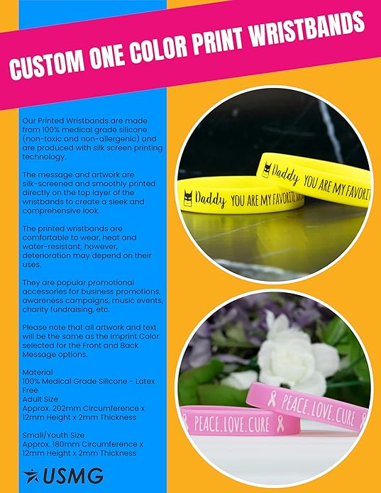 • High-Quality Printed Wristbands: Stand out with personalized wristbands featuring up to 25 characters, different font styles, and crafted from 100% medical-grade silicone for comfort and versatility. Customized in the USA by USMG for top-notch quality.