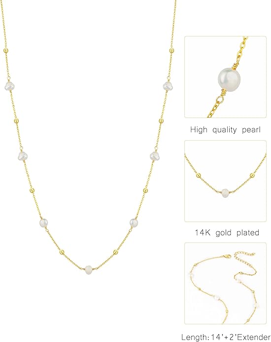 - Gold Dainty Necklace: Adorned with lustrous white pearls suspended from an elegant 14k gold chain necklaces , this necklace exudes a subtle opulence that transcends any event or attire.