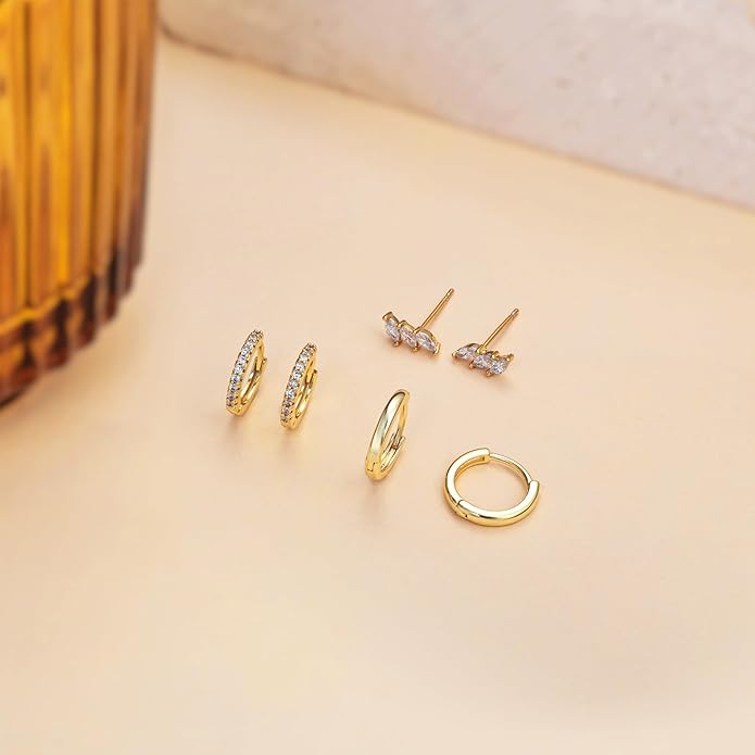 - Gold Huggie Hoop Earrings Set: Unveil your elegant sense of fashion with our exclusive collection featuring 3 pairs of 14K gold huggie hoop earrings. These small hoop earrings show combination of AAAAA-grade CZ huggies and gold hoop earrings designs