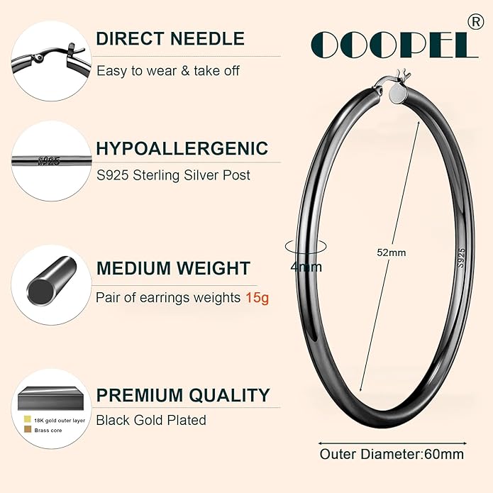 - Premium Quality Chunky Black Hoops:Thick black hoop earrings made of brass material, S925 sterling silve post.Hypoallergenic, lead & nickel free,Won't irritate your sensitive skin. These simple thick hoops will liven up your clothes without detracting from its simplicity. These black chunky hoop earrings can be paired with just anything for an effortless look, perfect for everyday wear and for formal occasions.