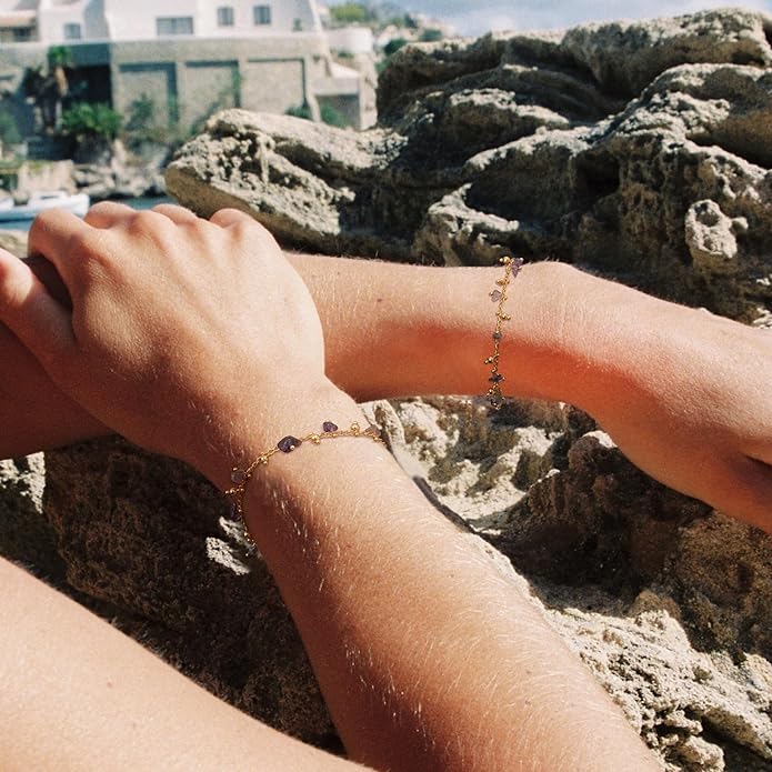 - PURPLE STONE CHARM. A stunning fusion of gold and purple stones adorning this bracelet, creates a regal and captivating aesthetic. Each stone within the bracelet showcases its unique shade and sparkle, catching the light with every movement
