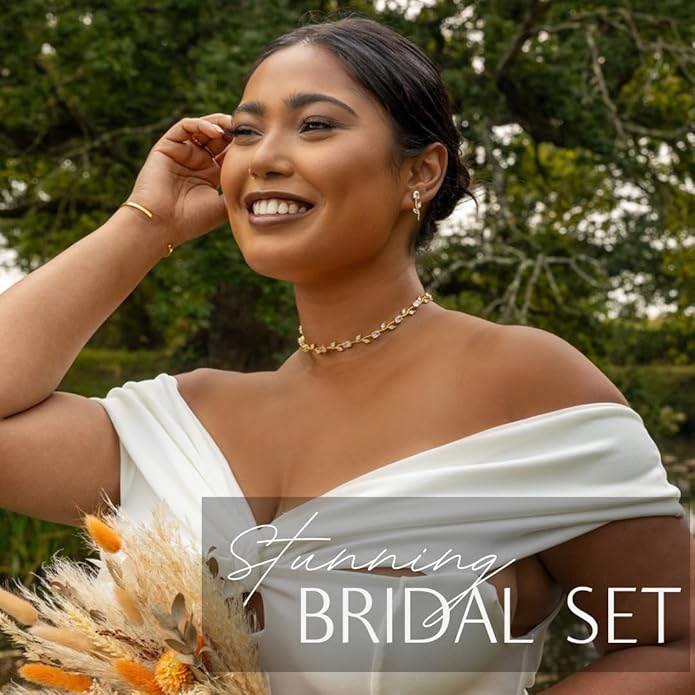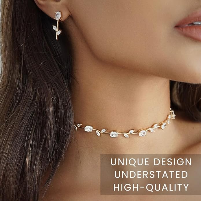 - ✨ UNIQUE DESIGN – Elevate any outfit with our rose gold choker necklace and earring set for women, featuring an elegant rose stem design encrusted with cubic zirconia. This 18k rose gold-plated piece is perfect as a bridal necklace, wedding necklace, or bridesmaid jewellery set, making it a must-have for formal events like proms and weddings.