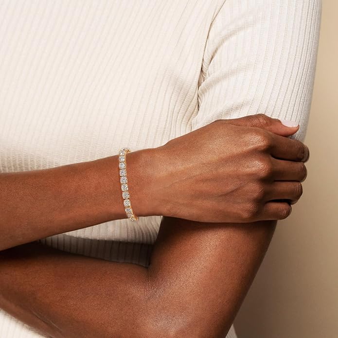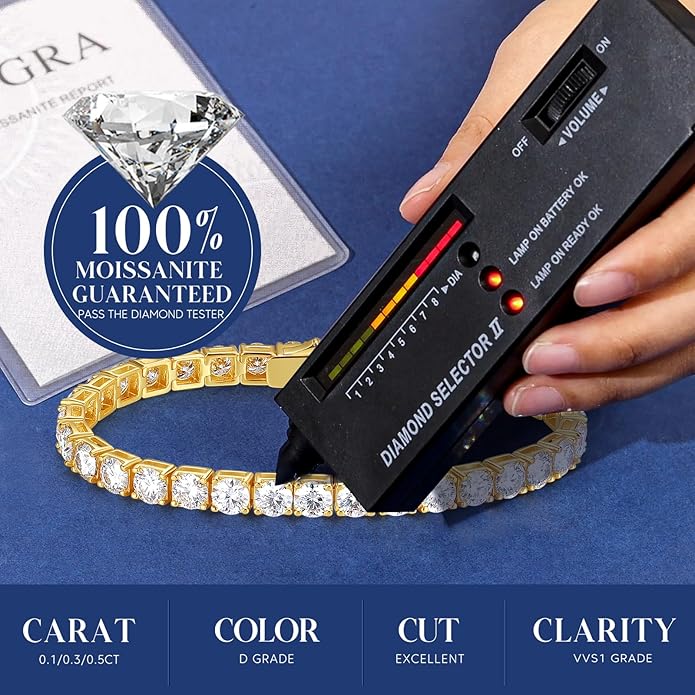 - STERLING SILVER AND TOP GRADE MOISSANITE:Moissanite stone size: 5mm, Lab-Grown D color/VVS1 clarity/3EX round brilliant cut moissanite. Crafted in 925 sterling silver with a 925 Stamp and plated thick 7 layers of 18k gold for added durability, this bracelet offers both durability and beauty. The clasp features an upgraded spring clasp that makes it stronger and more durable, it can be easily removed or put on.