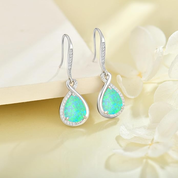 - Infinity dangle earrings size: 32.5 x 8mm(1.28 x 0.44in), main stone size: 8 x 12mm. The dangle earrings is inlaid with created opal for a unique look.Irish earrings exudes a charming atmosphere, noble and more attractive.