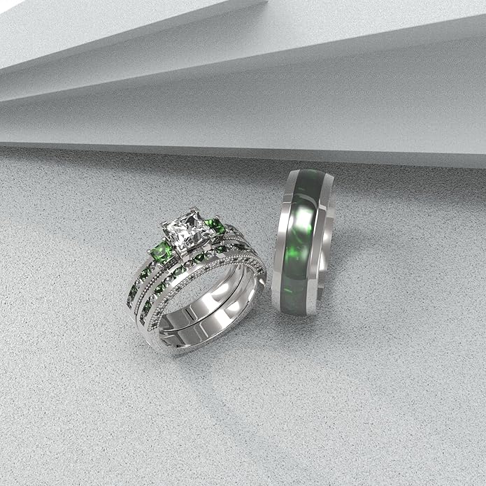 TWO RINGS Wedding Ring Sets His And Hers Promise Ring Couples Bridal Sets Women 925 Sterling Silver square Cz Man Stainless Steel Brushed Finished Wedding Bands