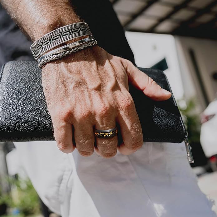 - Stylish Design: These men's tungsten steel wedding rings are available in black, gold. The unique design coupled with the multi-element setting makes these rings the perfect men's engagement ring or men's wedding band.