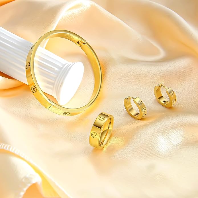 - Elegant Design: This 3-piece set includes a stunning 18K gold-plated love bracelet, ring, and hoop earrings adorned with sparkling cubic zirconia stones.
